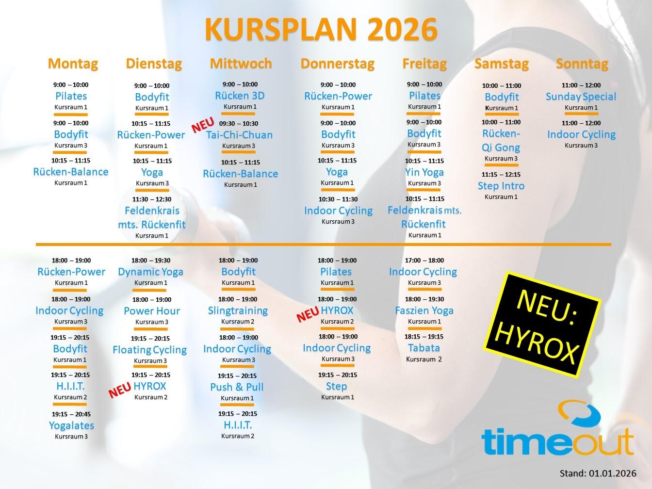Angefangen von A, wie Atmung – über P, wie Pilates – bis hin zu Z, wie ZUMBA®, bietet das tägliche Kursprogramm des timeout alles an, was das Herz begehrt. So können Sie, je nach Ihrem persönlichen Trainingsziel, individuell die richtige Auswahl treffen. Die Teilnahme an den Kursen stellt eine gute Ergänzung zum Kraft- und Ausdauertraining an den Geräten dar.