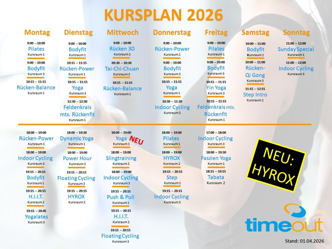 Angefangen von A, wie Atmung – über P, wie Pilates – bis hin zu Z, wie ZUMBA®, bietet das tägliche Kursprogramm des timeout alles an, was das Herz begehrt. So können Sie, je nach Ihrem persönlichen Trainingsziel, individuell die richtige Auswahl treffen. Die Teilnahme an den Kursen stellt eine gute Ergänzung zum Kraft- und Ausdauertraining an den Geräten dar.
